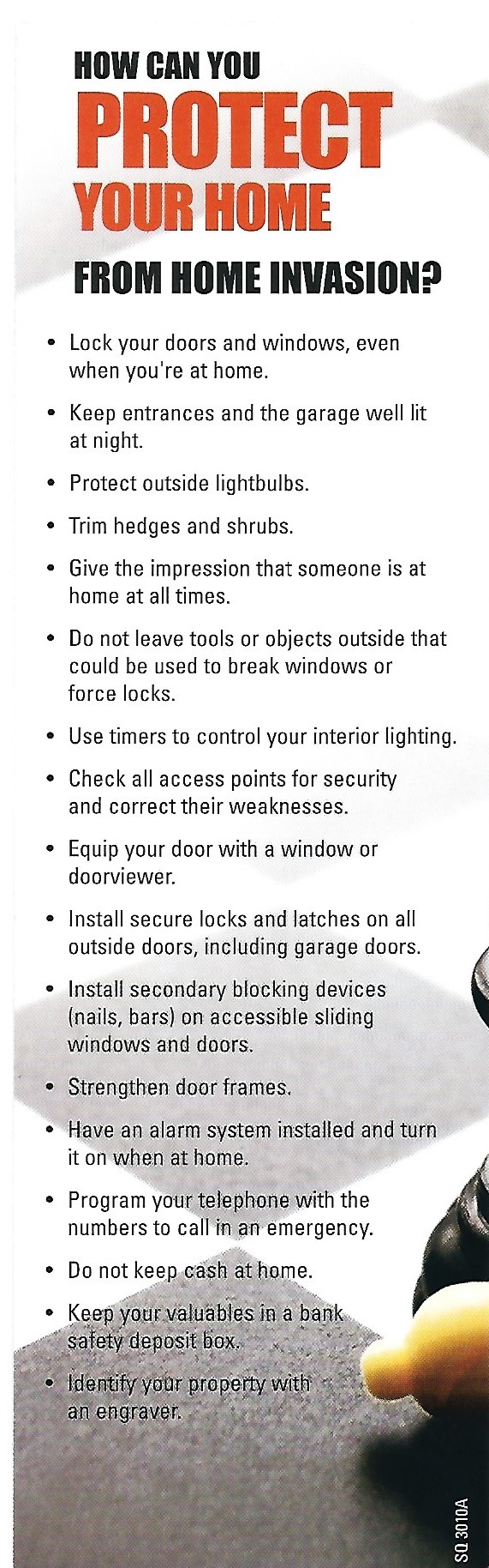 A few years ago, the Township of Wentworth called upon Marie-Josée Gervais of the SQ in Argenteuil to talk home invasion and ways to prevent them. June Parker, our liaison with the SQ was in attendants as well as a few Dunany residents. I came out of the meeting with two messages.