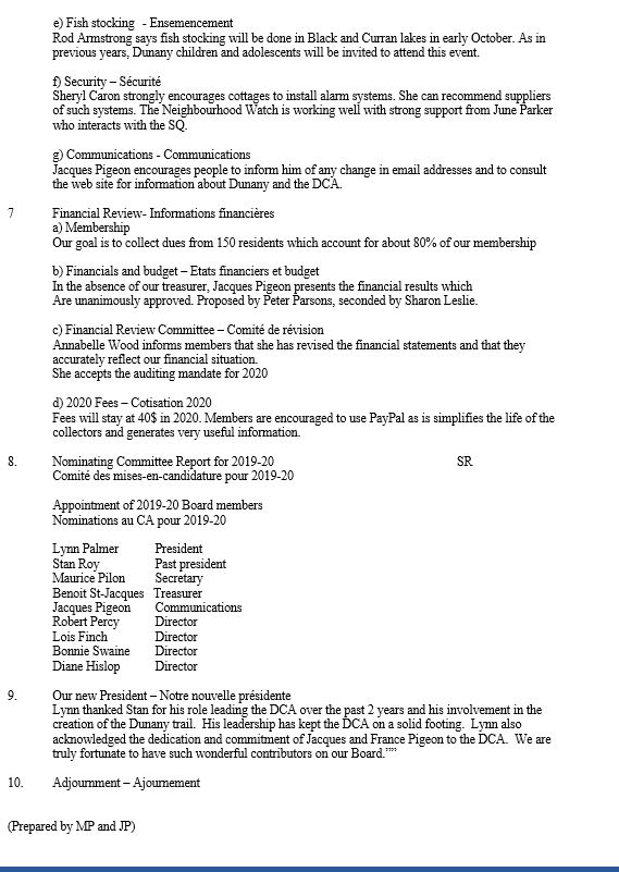 On Emergency Preparedness, JV spoke to the evolution of Climate Change and how everyone needs to be more vigilant. She distributed a tool that was used to examine the level of risk. The MRC of Argenteuil is of high risk in all areas (wind, fire, landslides, etc.). She noted that we are developing a plan for the Community for each Lake to ensure that we can help each other if a crisis arises. She also noted that we are responsible for our own health and security for the first 72 hours after a disaster/emergency and distributed a list of important telephone numbers. There is also information available on what should be in a Security Kit to handle such an event. Bonnie Swaine added that the coordinators of each lake are Johanne Vallee for Clear, Carole Sauvé on Black Lake, Andy Therrien on Curran and Bonnie Swaine on Boyd.