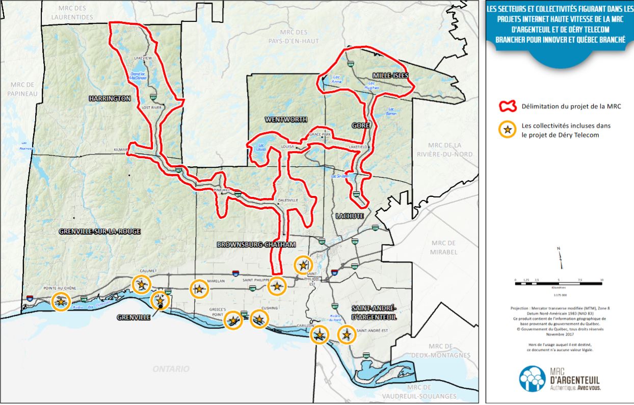 La MRC d’Argenteuil a récemment produit une carte (ci-dessous) décrivant le projet de déploiement du réseau de fibre optique pour offrir le service d’Internet haute vitesse aux communautés non desservies du nord de la MRC.