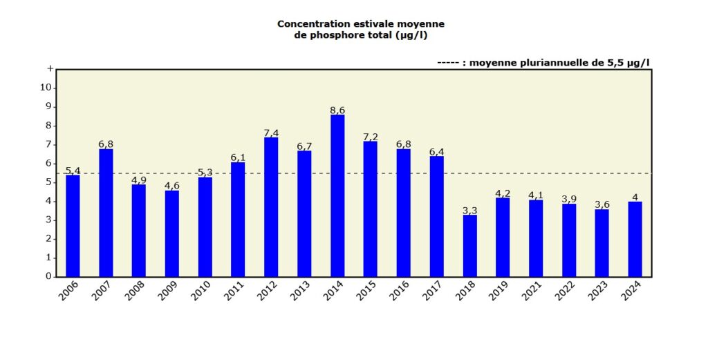 Le principal indicateur est donc le taux de phosphore mesuré en µg/litre. Tout aussi importantes sont les données de transparence que nous récoltons une dizaine de fois durant la saison estivale. Une eau transparente est le signe qu’il y a peu de phosphore et de chlorophylle (algues en suspension).